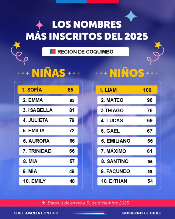 El Servicio de Registro Civil e Identificación dio a conocer el ranking de los nombres más inscritos en el país y en la Región de Coquimbo durante el año 2025, confirmando tendencias que se han mantenido con fuerza en la última década. A nivel nacional, Emma se posicionó por cuarto año consecutivo como el nombre más inscrito entre las niñas, liderazgo que mantiene desde 2022, mientras que Mateo se consolidó como el nombre masculino más elegido por noveno año seguido, encabezando las preferencias desde 2017. De mantenerse esta tendencia durante 2026, Mateo podría transformarse en el nombre masculino más inscrito de una década completa en Chile.